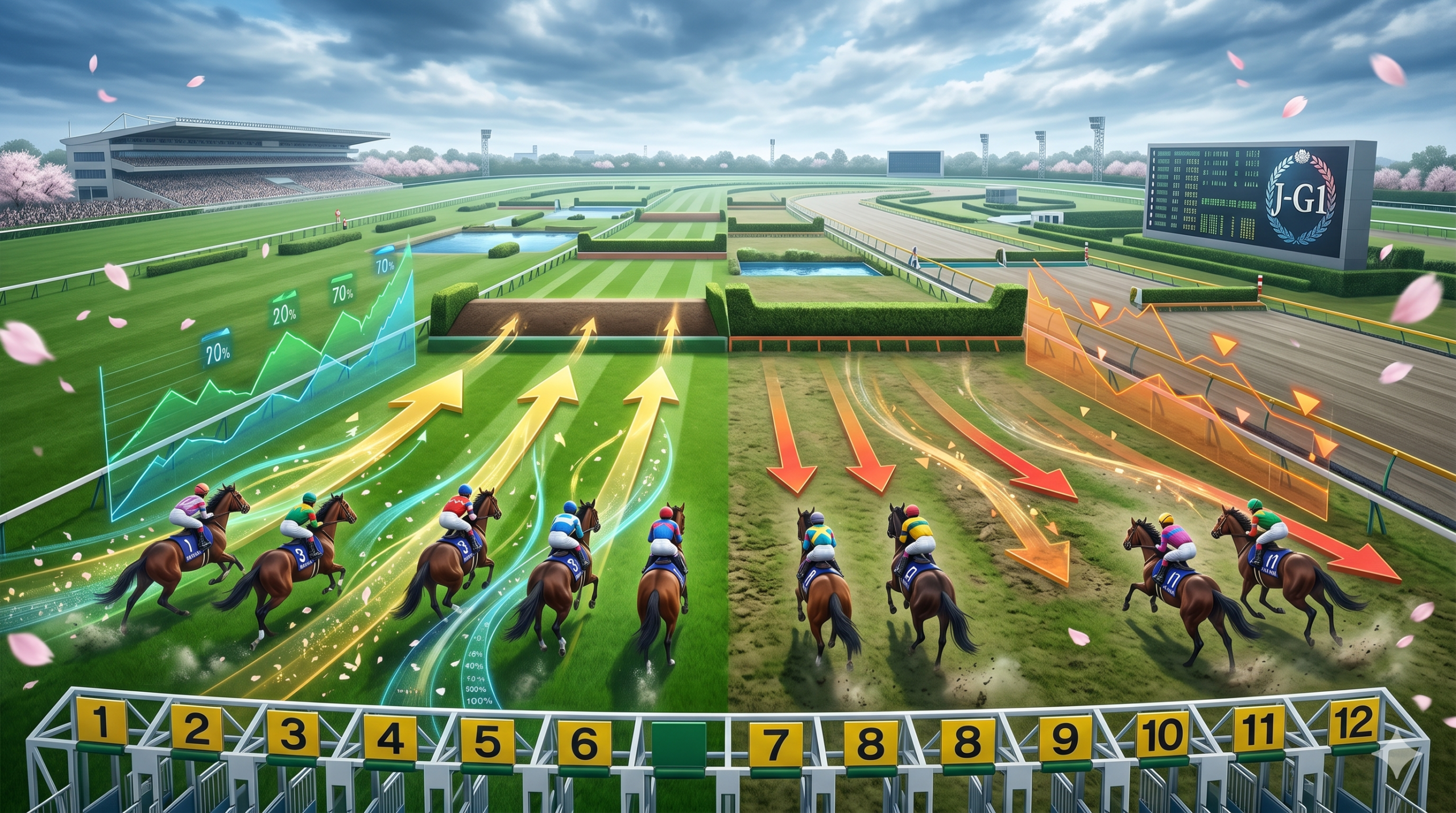 ・天候の悪化で踏み切り地点が荒れた場合内枠のメリットが消滅し状態の良い外側を飛越できる外枠が圧倒的に有利になる逆転現象が想定される